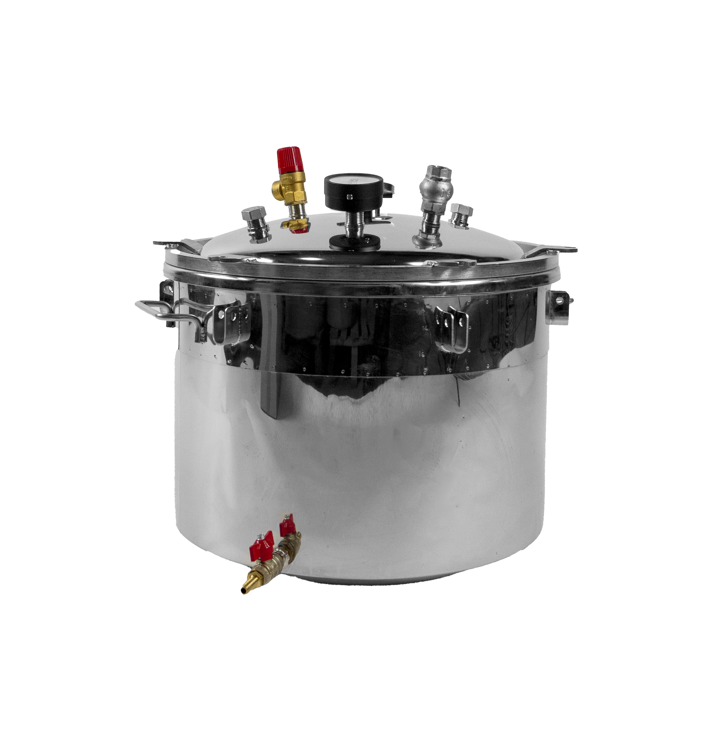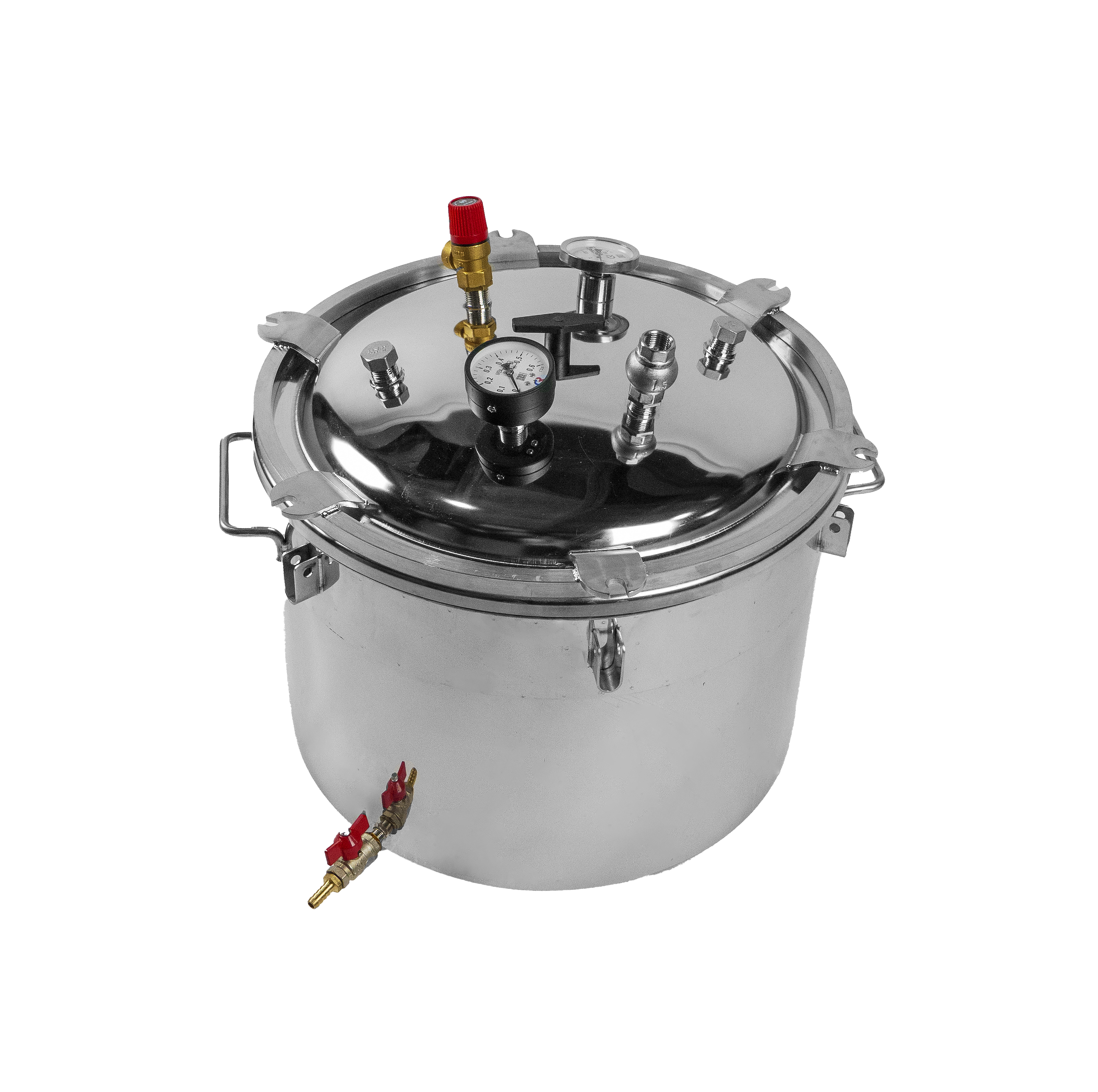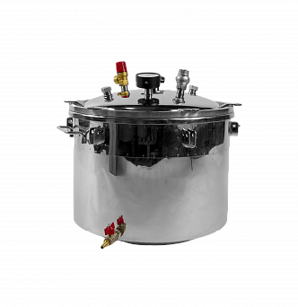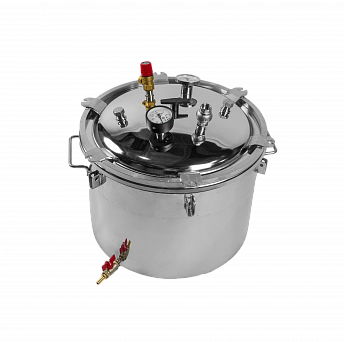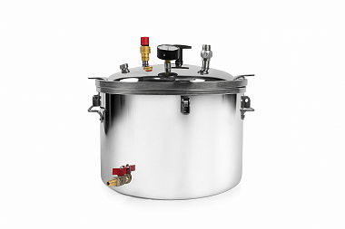 Автоклав рассчитан на нагрев от газовой или электрической плиты, прост в эксплуатации и не требует подключения к сети. Комплектация включает всё необходимое: фальшдно, сливной кран, шланг, манометр, термометр и книгу рецептов.