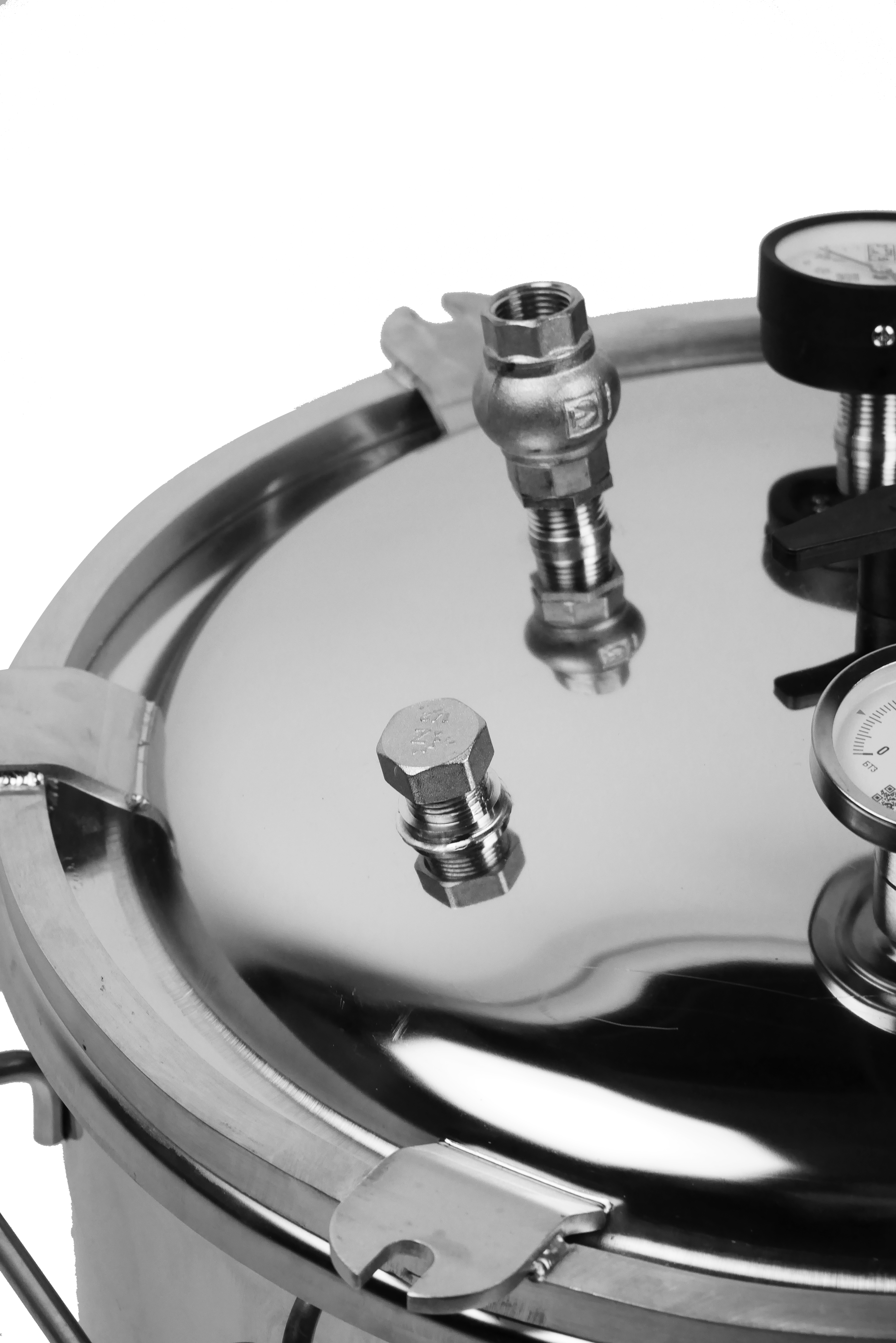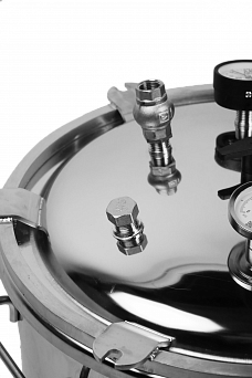 - Температура стерилизации контролируется с помощью стрелочного термометра, расположенного на крышке автоклава.